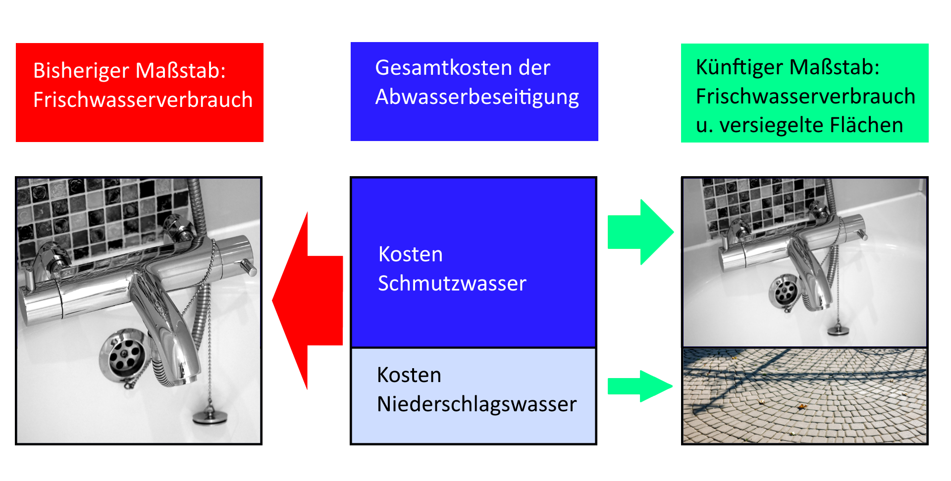Bislang werden die Entwässerungs- oder Abwassergebühren nach dem Frischwassermaßstab erhoben. Darin sind allerdings auch die Kosten für die Beseitigung von Niederschlagswasser, z.B. von Dächern, Plätzen und Straßen, enthalten. Künftig werden die Kosten der Entwässerung aufgeteilt – also gesplittet, daher der Name Gesplittete Abwassergebühr – in ihre Anteile für die Kosten der Schmutzwasserbeseitigung und die der Beseitigung des Niederschlagswassers. Da bereits in der Vergangenheit alle Kosten auf die Abwassergebühr umgelegt wurden, entsteht also keine zusätzliche Gebühr.