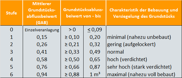 Folgende Stufen mit entsprechenden Grundstücksabflussbeiwerten (GAB) wurden festgelegt: